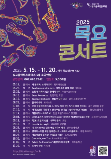 [뉴스앤톡] 광주문화재단은 오는 9월 4일, 11일, 18일, 25일 목요일 저녁 7시 30분, 빛고을아트스페이스 5층 소공연장에서 9월의 목요콘서트 무대를 개최한다고 밝혔다.