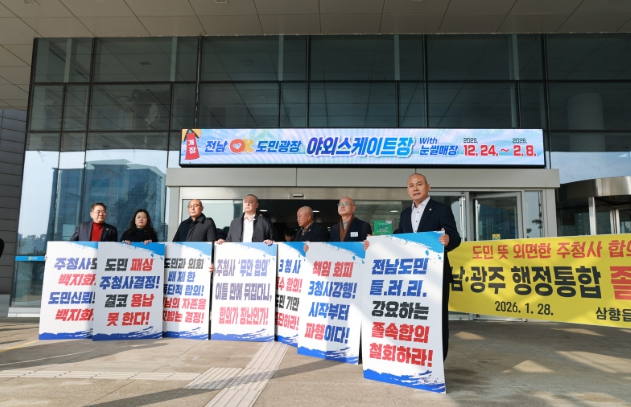 [뉴스앤톡] 무안군의회가 29일 전남도청에서 열린 전남·광주 행정통합 의견수렴 간담회 참석에 앞서 주청사 합의 번복을 강력히 규탄했다.