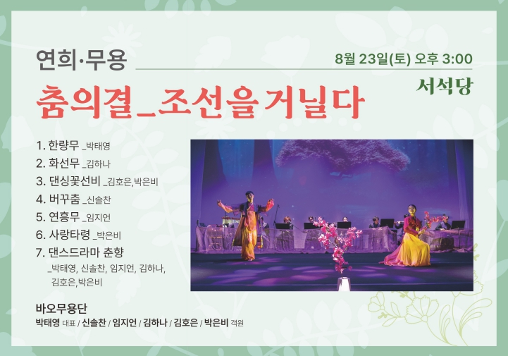 [뉴스앤톡] 광주문화재단(대표이사 노희용) 전통문화관은 오는 8월 23일 오후 3시, 토요 상설공연 15회차 무대를 선보인다. 이번 공연 '춤의 결, 조선을 거닐다'는 조선 시대의 춤을 탐구·계승하는 동시에 현대적으로 재해석하여, 한국무용의 새로운 가능성을 모색하고자 기획됐다.