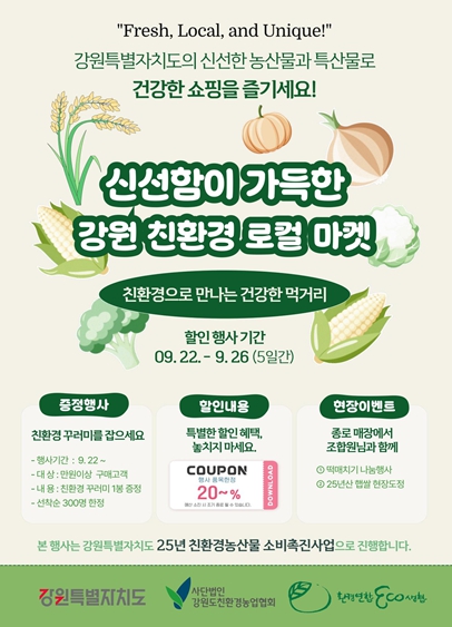 [뉴스앤톡] 강원특별자치도는 9월 22일부터 26일까지 5일간 두레생협 전국 111개 매장에서 '강원특별자치도 친환경 로컬마켓 2탄'을 동시에 개최한다고 밝혔다.