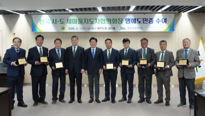 제주도는 1일 오전 도청 삼다홀에서 전국 시도 새마을지도자협의회장 명예도민증 수여식을 열었다. 행사에는 양윤호 새마을지도자중앙협의회장을 비롯해 전국 각 시도를 대표하는 협의회장 등 20명이 참석했다.