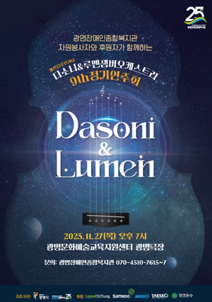 [뉴스앤톡] 광명장애인종합복지관은 개관 25주년을 맞아 오는 11월 27일 오후 7시, 광명극장에서 ‘다소니&루멘챔버오케스트라 제9회 정기연주회’를 개최한다. 이번 연주회는 복지관을 위해 꾸준히 후원과 자원봉사를 실천해온 후원자와 자원봉사자를 초청해, 장애인 예술가의 무대를 함께 즐기는 감사의 자리로 마련됐다. 복지관은 이번 행사를 통해 지역사회가 장애예술을 보다 가까이 경험하고, 문화예술을 매개로 한 긍정적 인식 변화가 확산되기를 기대하고 있다.