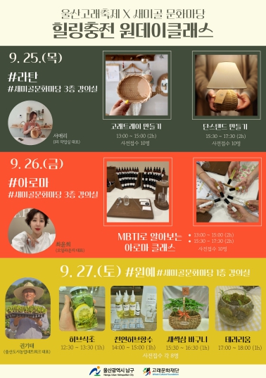 [뉴스앤톡] 남구고래문화재단(이사장 서동욱)은 9월 25일부터 27일까지 3일간 새미골 문화마당에서 ‘2025 울산고래축제’와 연계한 특별 프로그램인 ‘힐링충전 원데이클래스’를 운영한다고 밝혔다.