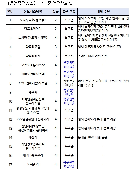 다만, 고용노동부의 노동포털 등 12개 시스템이 여전히 중단된 상황으로 임시 대표 누리집(홈페이지) 개통, 기관 대표 이메일 접수 등 대민업무에 불편을 최소화하기 위한 대체 방안을 마련·시행 중이다.