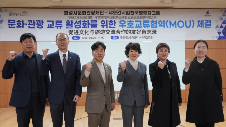 [뉴스앤톡] 화성시문화관광재단은 3월 20일 동탄복합문화센터에서 중국 후베이성에 위치한 인구 약 417만 명 규모의 산업·관광 도시 샤오간시의 환천국유투자그룹과 문화·관광 교류 활성화를 위한 업무협약(MOU)을 체결했다.