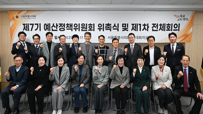 [뉴스앤톡] 서울특별시의회는 2025년 12월 17일 제1대회의실에서 위촉식과 제1차 전체회의를 개최하여 시의회의 예산정책기능 강화를 위한'제7기 예산정책위원회'를 출범시켰다. 이날 최호정 의장(서초4, 국민의힘)은 위원들에게 위촉장을 수여했고, 이후 진행된 제1차 전체회의에서 신복자 의원(동대문4, 국민의힘)이 위원장으로 선출됐다.