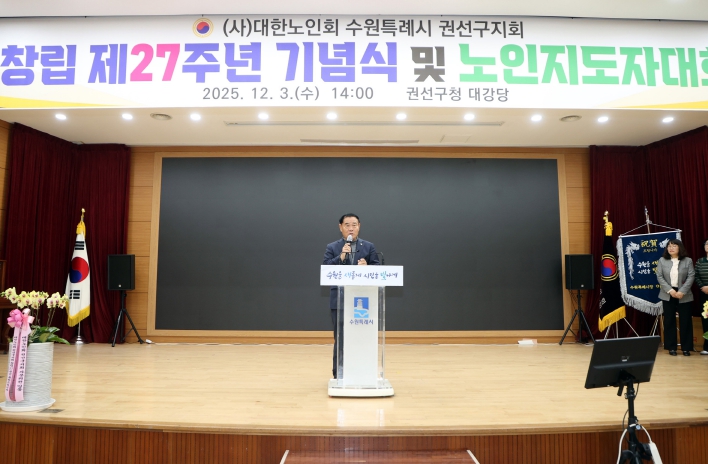 [뉴스앤톡] 수원특례시의회는 3일 권선구청 대회의실에서 열린‘대한노인회 수원시 권선지구 제27주년 기념식 및 노인지도자대회’에 참석해 어르신 지도자들의 노고를 축하하고 격려했다.
