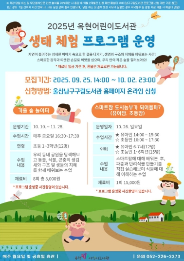 [뉴스앤톡] 남구 옥현어린이도서관은 어린이들을 위한 ‘2025년 생태 체험프로그램’을 오는 10월 10일부터 11월 28일까지 운영한다고 밝혔다.