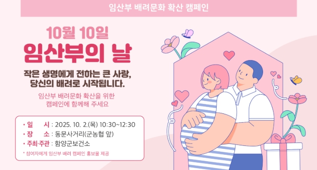 [뉴스앤톡] 함양군은 오는 10월 2일 함양읍 일원에서 ‘2025 임산부의 날 기념 캠페인’을 개최한다. 이번 캠페인은 임산부에 대한 존중과 배려 문화를 확산하고, 군민의 인식 개선과 공감대 형성을 위해 마련됐다.