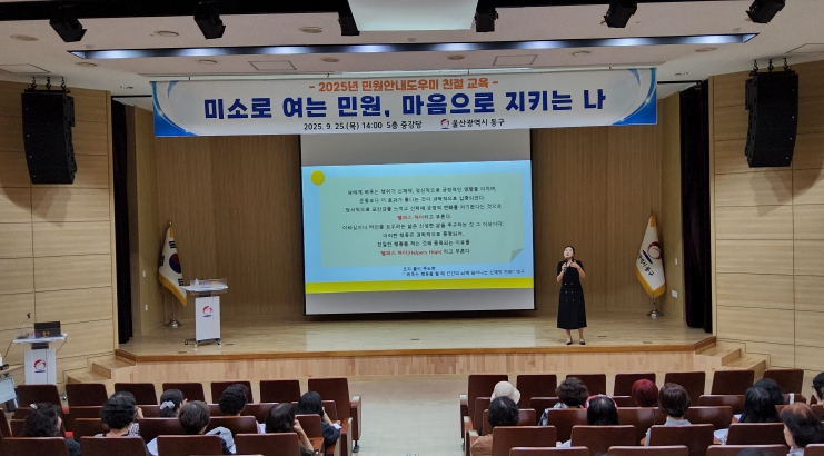 [뉴스앤톡] 울산 동구는 9월 25일 동구청 5층 중강당에서 구청과 보건소, 종합사회복지관의 자원봉사 민원 안내 도우미 60여 명을 대상으로 친절 교육을 했다.