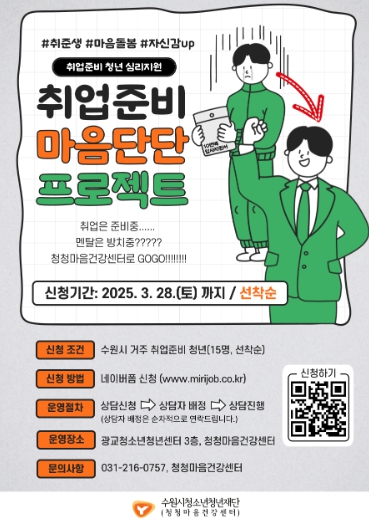 [뉴스앤톡] 수원시청소년청년재단(이사장 최종진) 청청마음건강센터는 취업 준비로 인한 심리적 압박감과 경제적 부담을 동시에 겪는 청년들을 위해 2026. 취업준비 청년 심리지원'취업준비 마음단단 프로젝트'참여자를 모집한다고 밝혔다.
